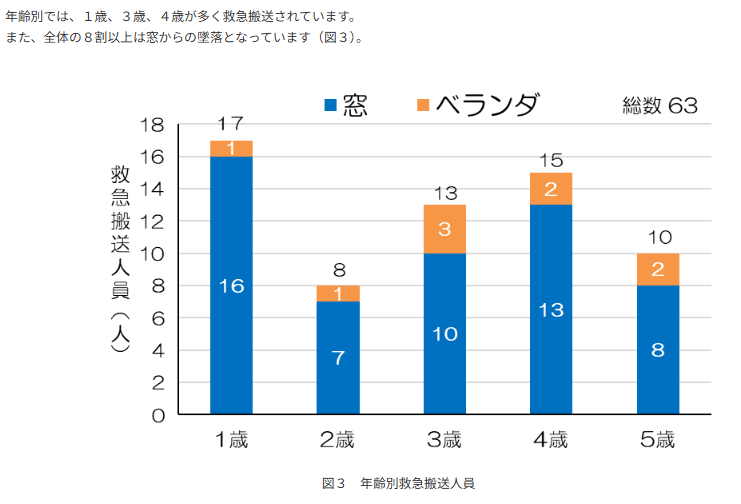 東京消防庁の調査では、 1歳〜5歳まで幅広い年齢で転落事故が発生しています。